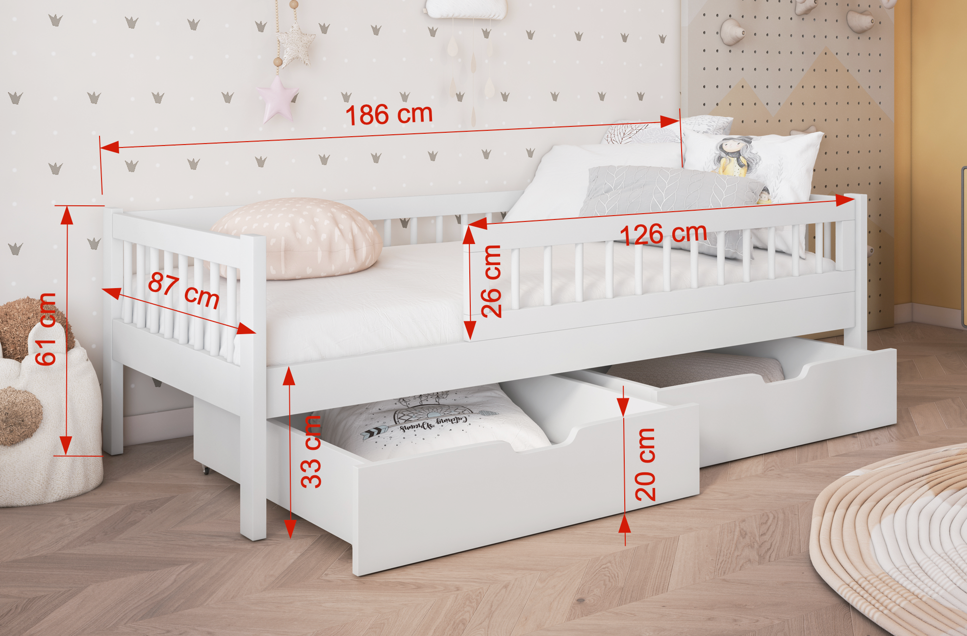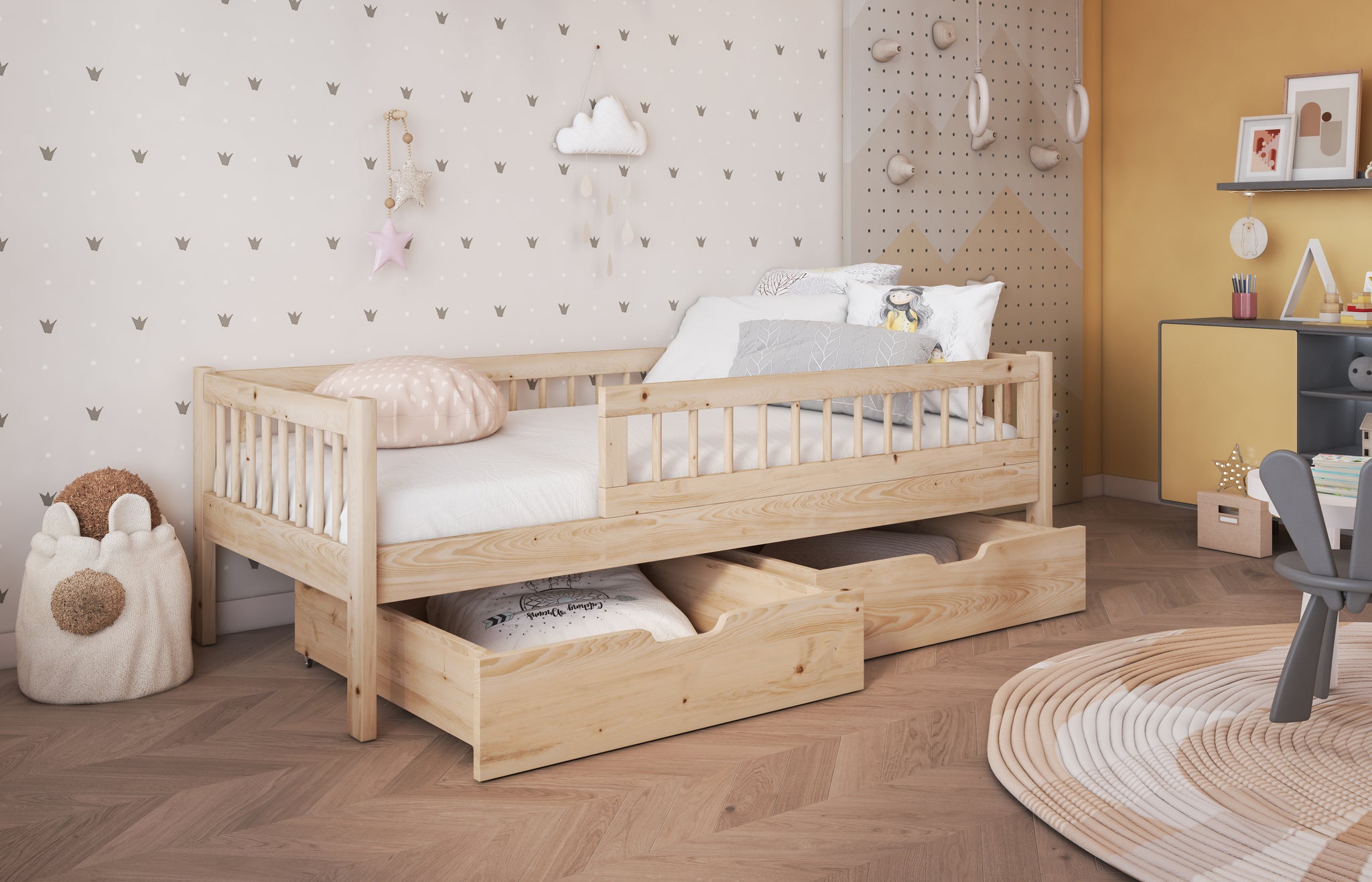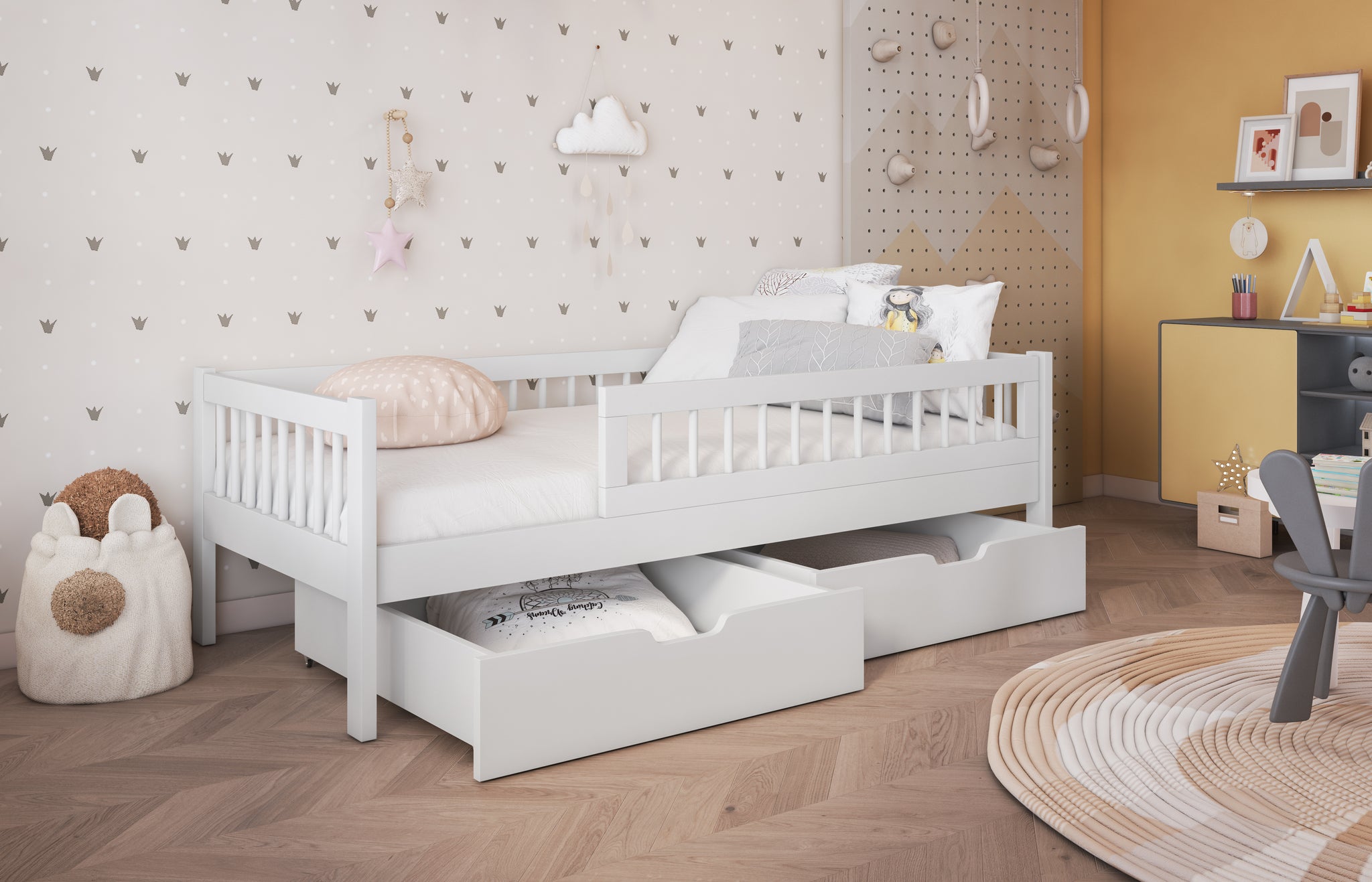 Kinderbett FLORES aus Massivholz – mit Schubladen, Lattenrost und 8 cm Matratze – Weiß oder Kiefer Natur