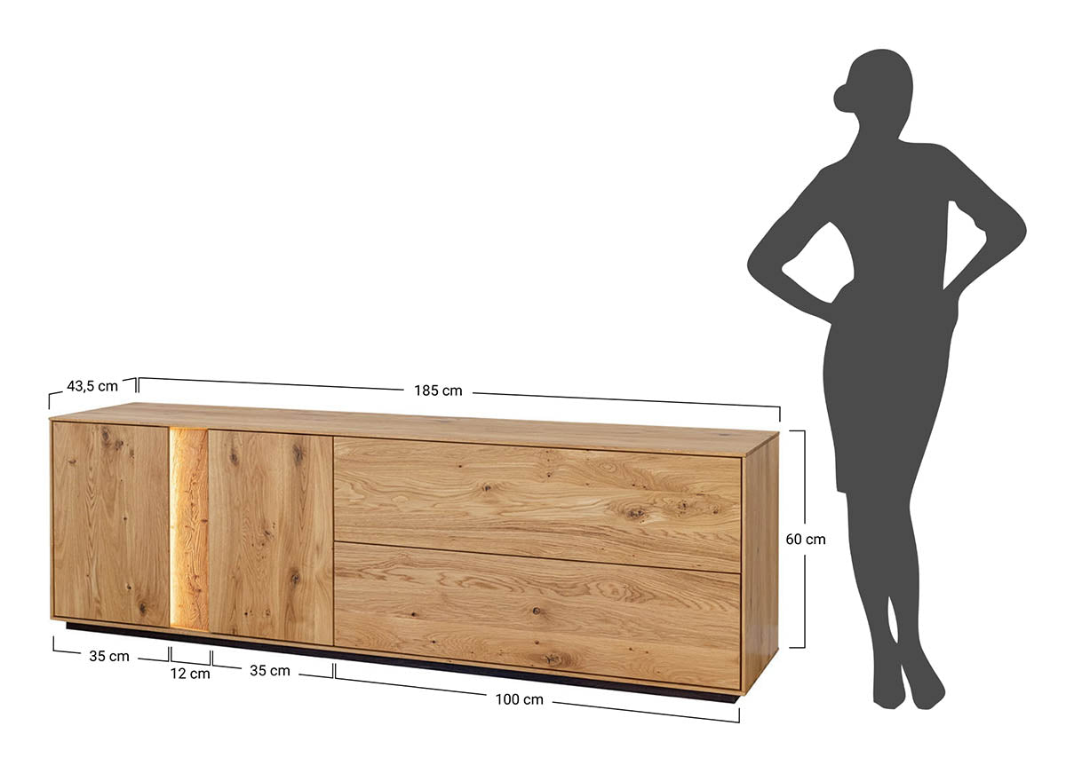 Mit ihrer großzügigen Breite von 185 cm bietet die Kommode ausreichend Platz für große Fernseher und Multimedia-Geräte. Gleichzeitig fügt sich das Möbelstück dank seiner klaren Linien und natürlichen Optik perfekt in moderne, skandinavische, industrielle oder klassische Wohnräume ein.