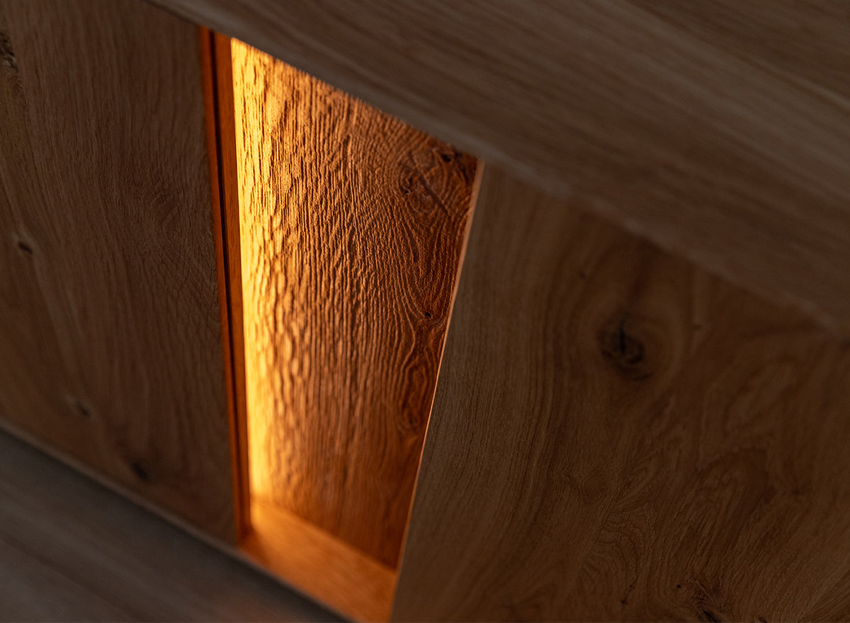Die Kommode wird aus massiver Wildeiche gefertigt – einem besonders robusten und langlebigen Naturmaterial. Die Oberfläche ist geölt, wodurch die natürliche Maserung und Farbstruktur des Holzes besonders hervorgehoben werden.