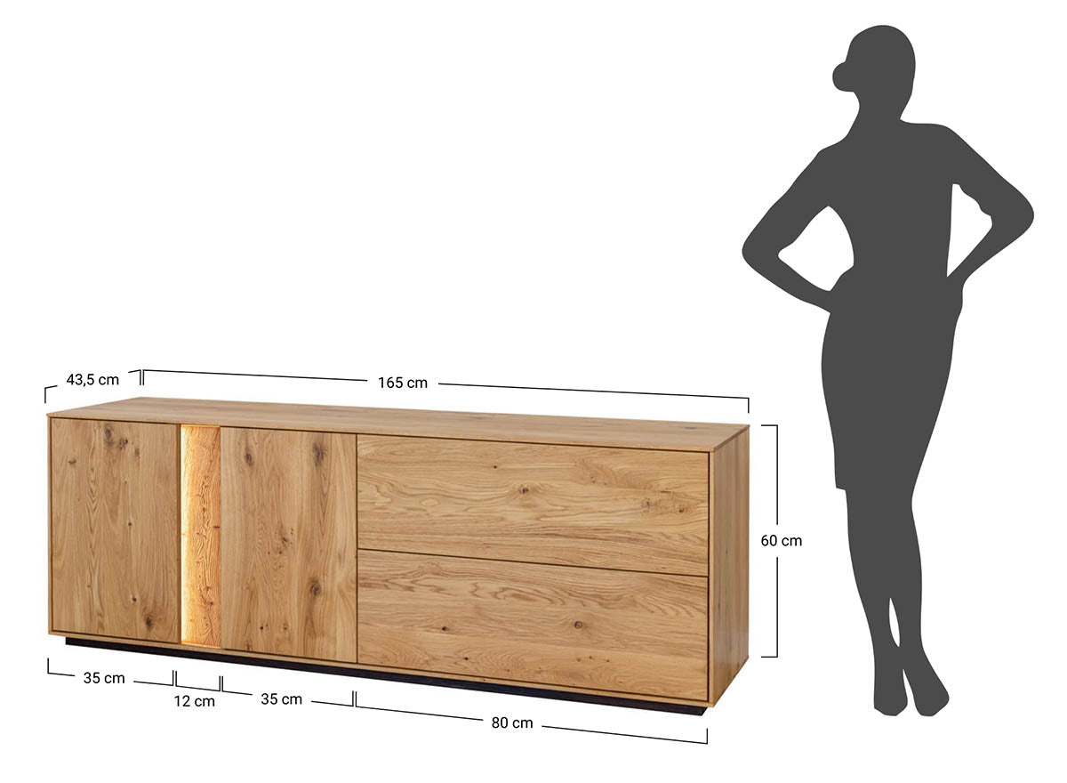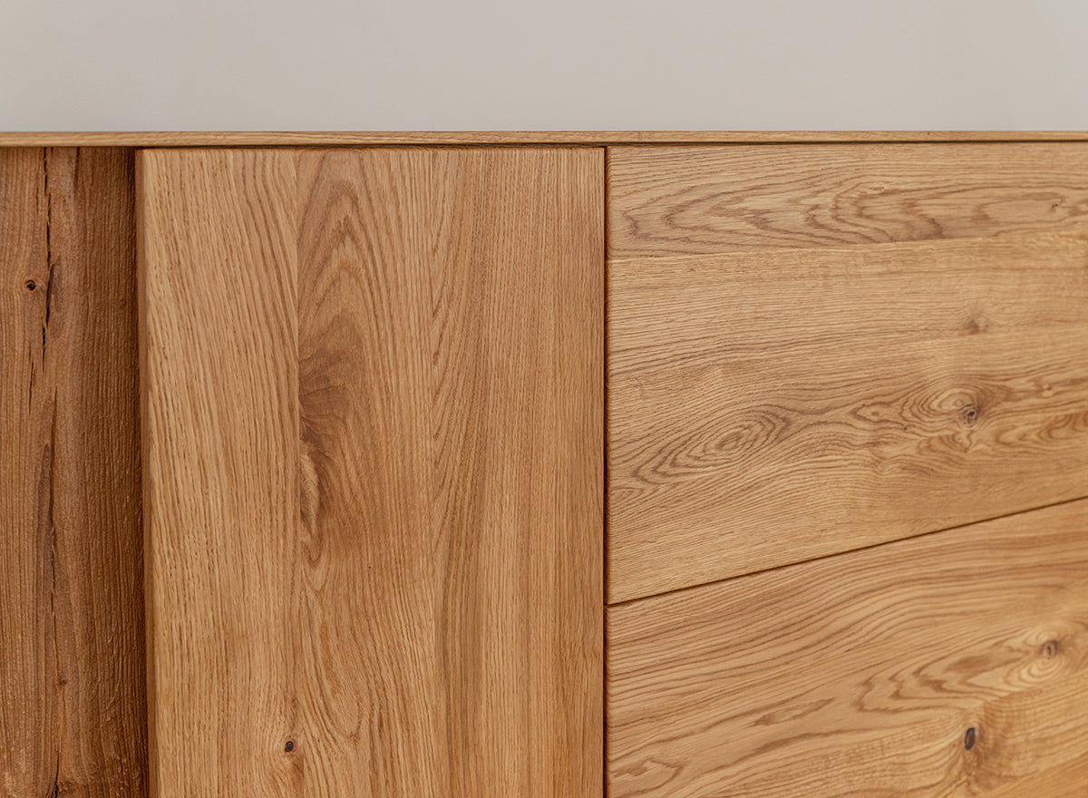 Die Kommode wird aus massivem Wildeichenholz gefertigt. Da Holz ein Naturprodukt ist, können Maserung, Struktur und Farbton leicht variieren. Diese natürlichen Unterschiede machen jedes Möbelstück zu einem einzigartigen Unikat.