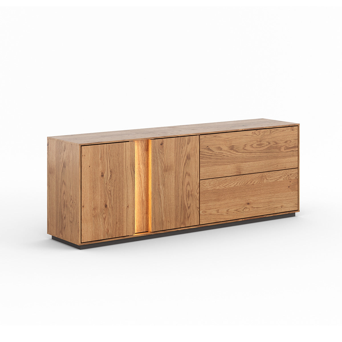 Die TV-Kommode Collodi 1.1 verbindet modernes Design mit der natürlichen Schönheit von massivem Wildeichenholz. Der warme, goldene Farbton der geölten Eiche sowie die markante Maserung mit sichtbaren Ästen verleihen diesem Möbelstück eine besonders natürliche und hochwertige Ausstrahlung.