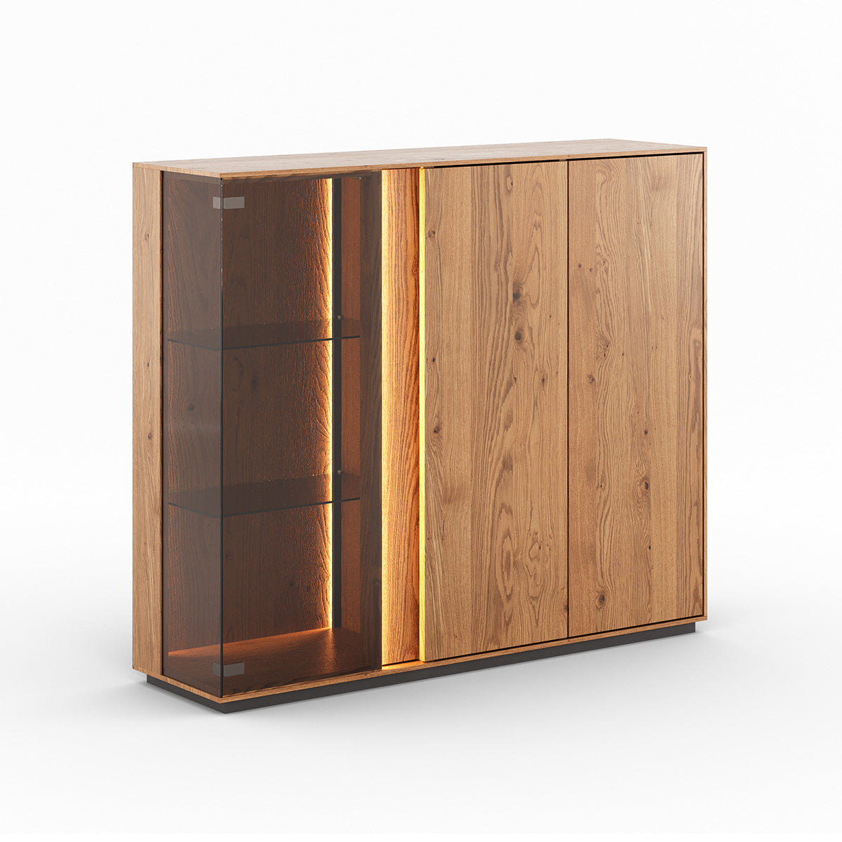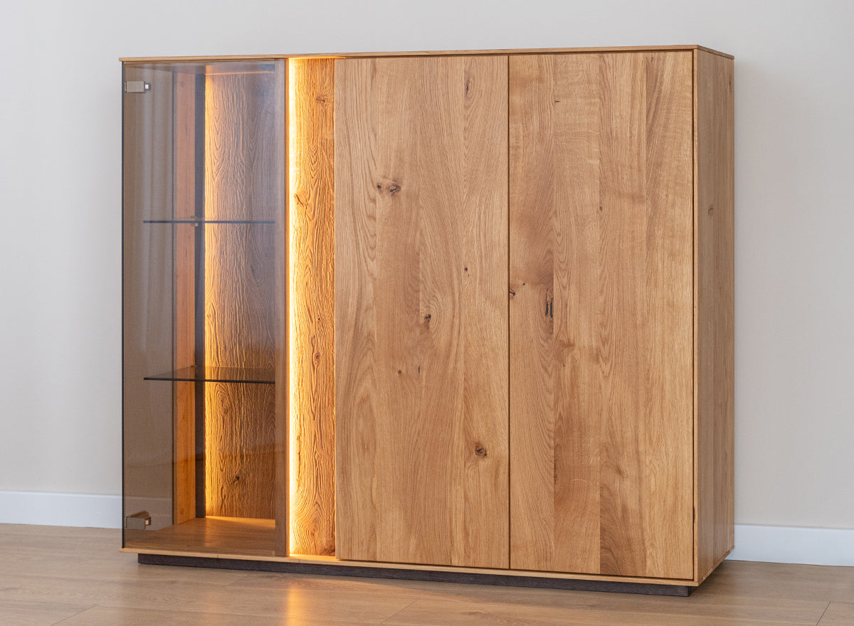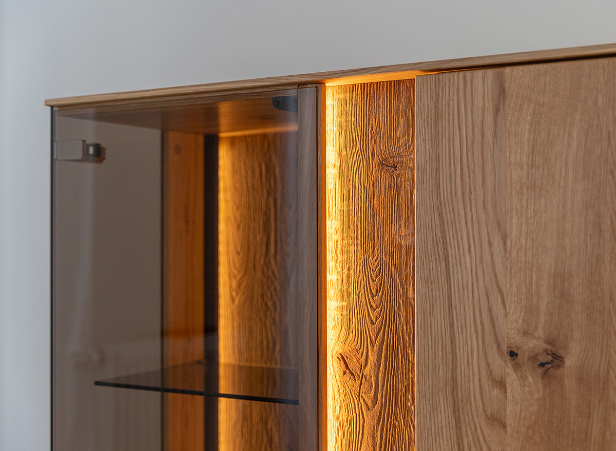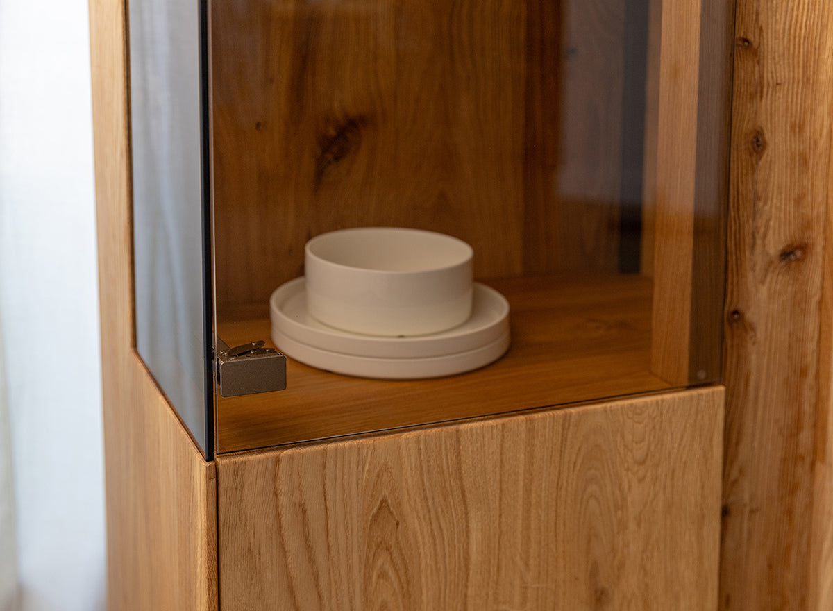 Die Vitrine wird aus massivem Wildeichenholz gefertigt. Da Holz ein Naturprodukt ist, können Maserung, Farbton und Struktur leicht variieren. Diese natürlichen Unterschiede machen jedes Möbelstück zu einem einzigartigen Unikat.