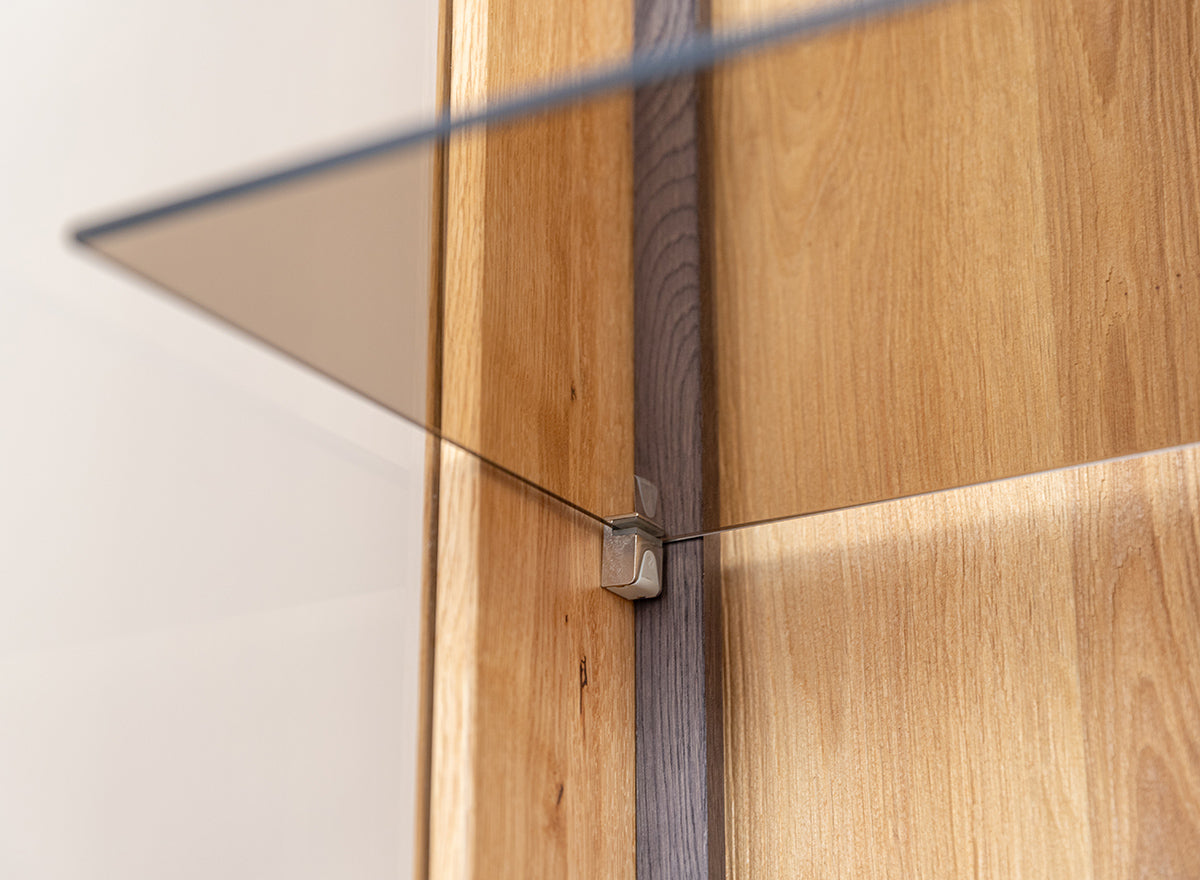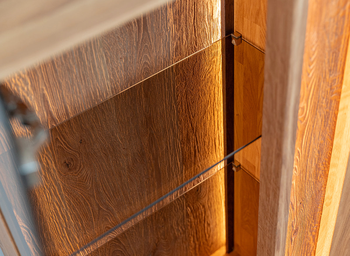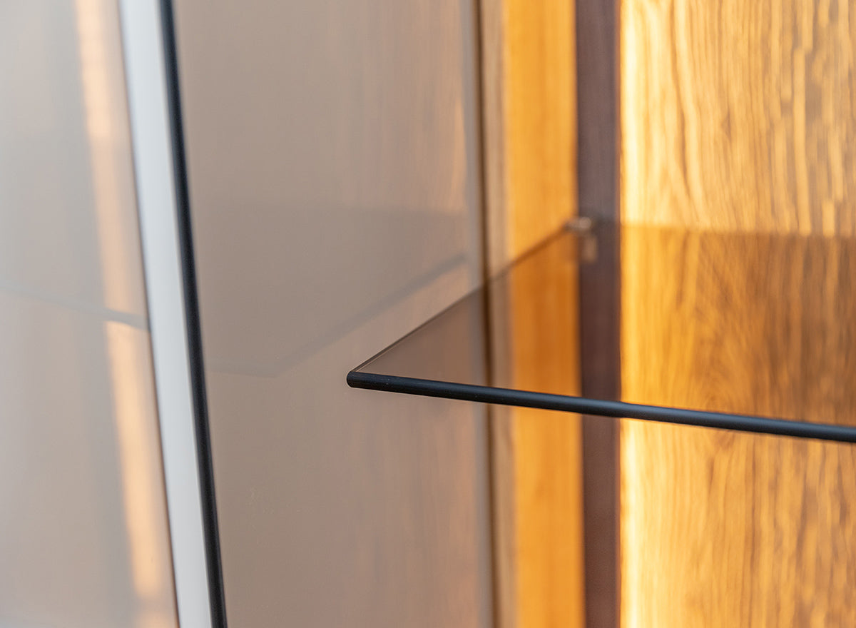 Der verglaste Bereich mit Glasböden aus gehärtetem Sicherheitsglas ermöglicht eine elegante Präsentation Ihrer Lieblingsstücke